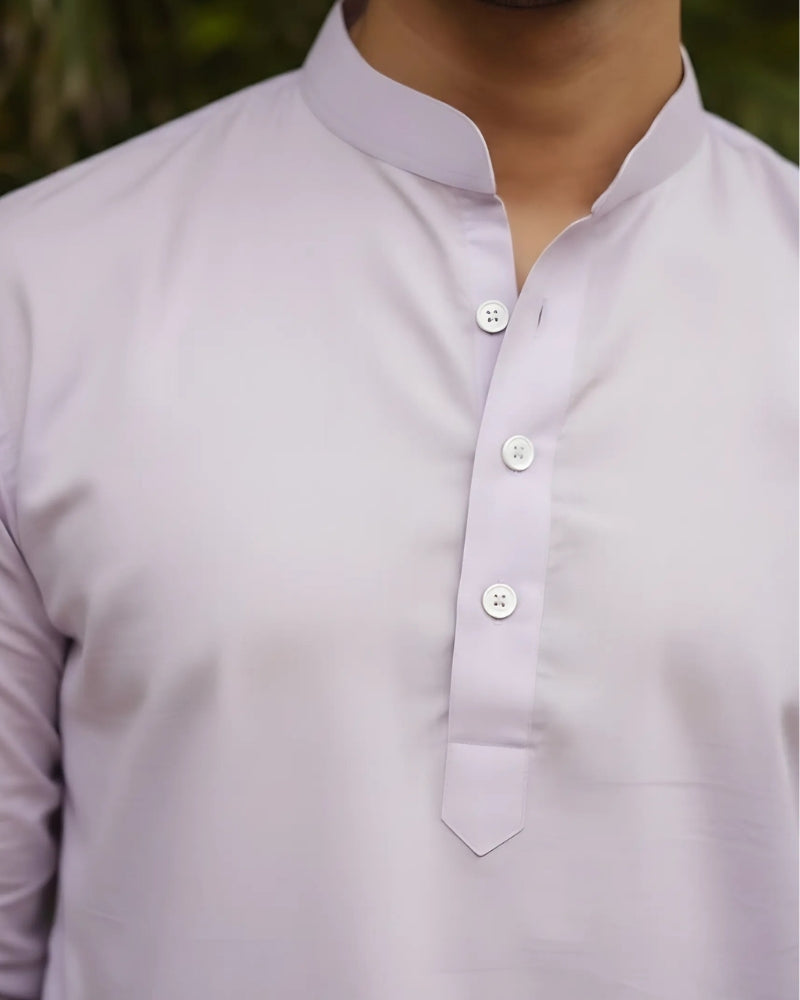 This Lilac Short Kurta brings a refreshing contemporary tone, elevated with subtle white Ajrakh print on the inner cuff.